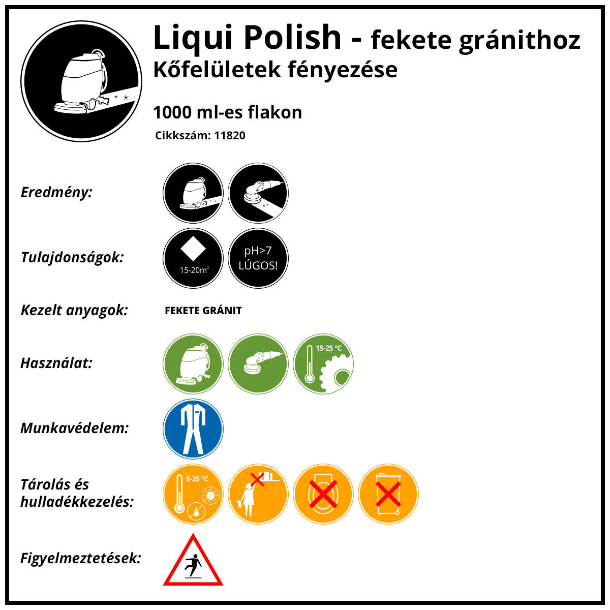 Polírozott, nagyon sötét színű kemény kövek, mint pl. Nero, Nero Impala, Star Galaxy, Orientale, Basalto Columnare fényességének fokozásához alkalmazható, használatra kész polírozó folyadék gépi alkalmazáshoz. Az élek, kisméretű felületek és a csepegtető tálcák fényesítése könnyen elvégezhetők vele. A termékkel fényezhetők, polírozhatók a domborművek, sírkövek, mellvédek (könyöklők). A termék ipari felhasználással alkalmas a már lefektetett padlóburkolatok fényesítésére. Alkalmazható reziduális nedvességtartalmú felületeken is.